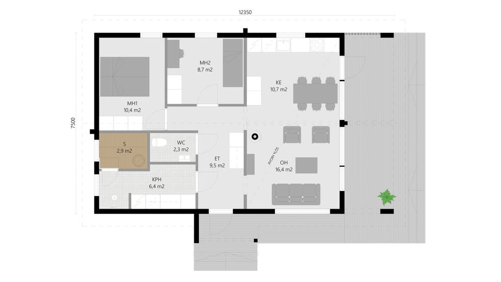 Í Alku húsinu eru tvö svefnherbergi og rúmgott baðherbergi sem einnig getur hýst þvottavél. Þetta gerir Alku húsið að skynsamlegu vali, til dæmis, sem annað heimili.
