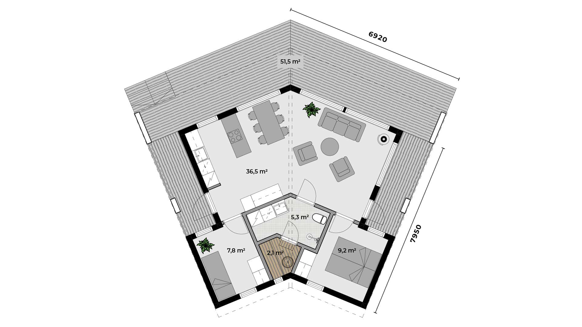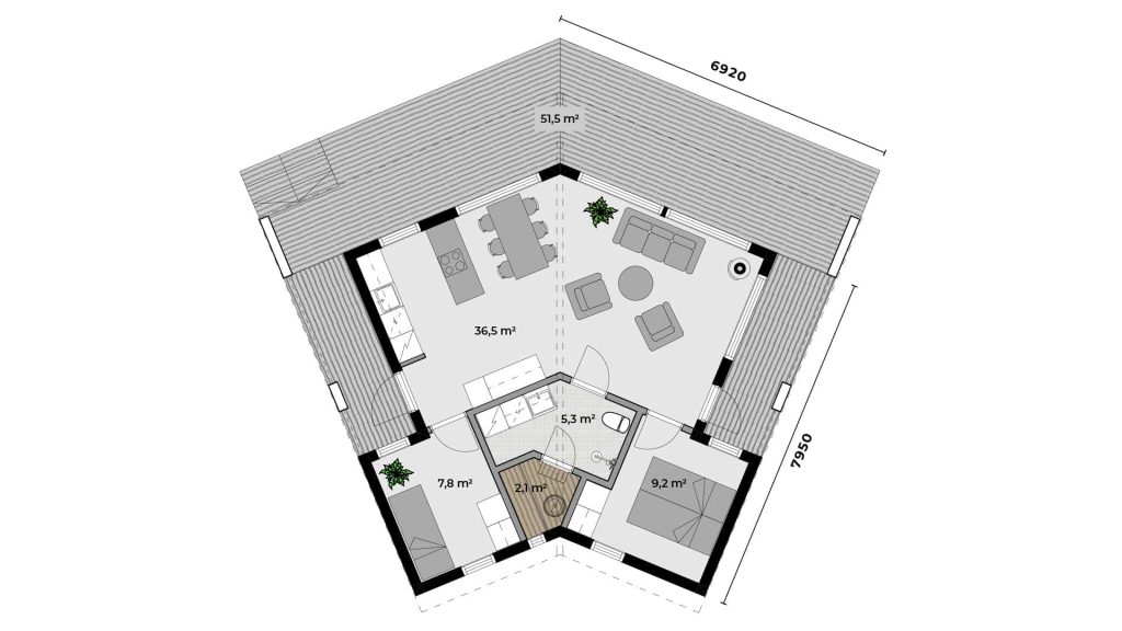Markmið nútíma Nuuna M 70 módelisins er að ná fram sem hagkvæmasta nýtingu rýmisins. Form byggingarinnar er langt frá því hefðbundna.
