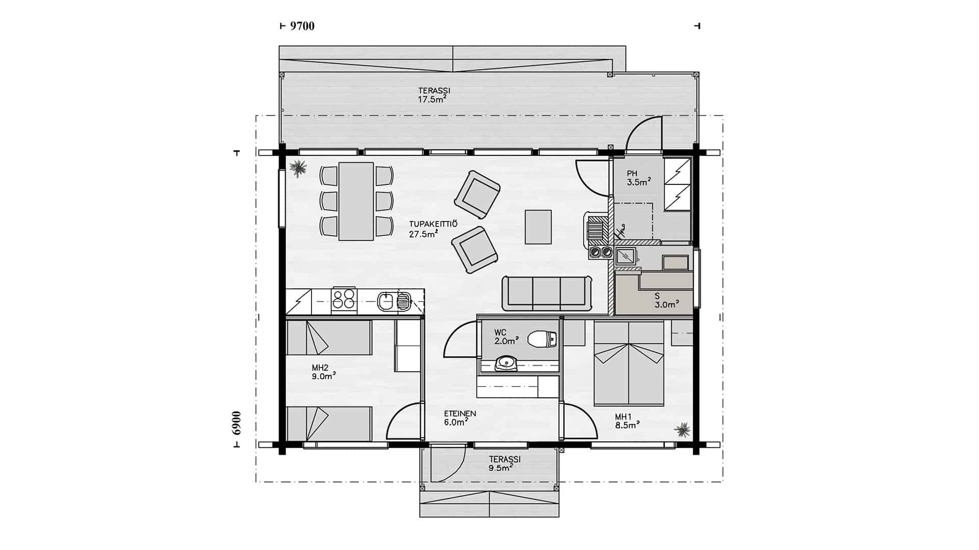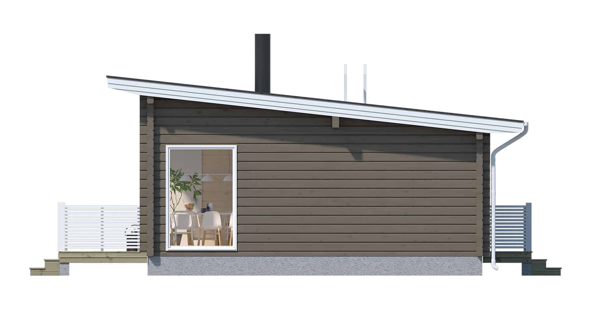 Bjálkahúsið Pesä 67 kemur á óvart! Þegar gengið er inn um útidyrnar opnast bein sýn út í garðinn frá stofugluggunum. Ljósið flæðir um allt bjálkahúsið!