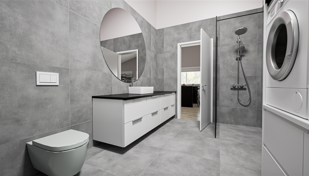 - Baðherbergi: Innrétting með handlaug. Vegghengt salerni og sturtuklefi. Tengingar fyrir þvottavél og þurrkara.