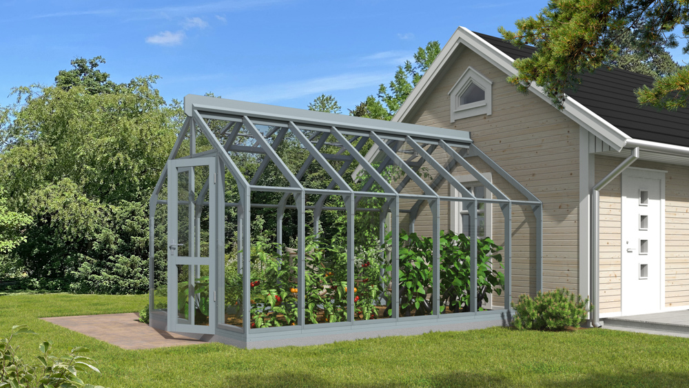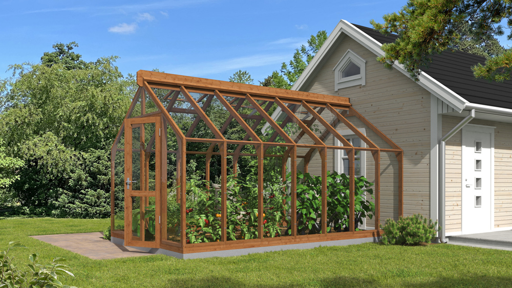 Á þessum húsum hvílir viðargrindin upp við húsvegg og myndar þannig heild og geta verið viðbót við t.d. stofuna eða annað rými.